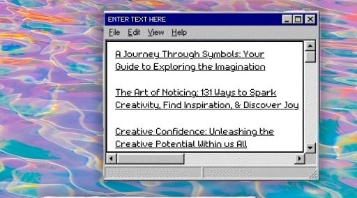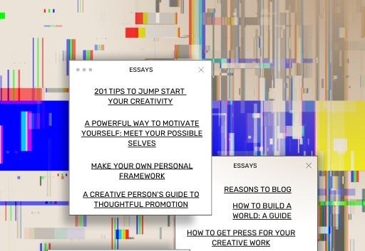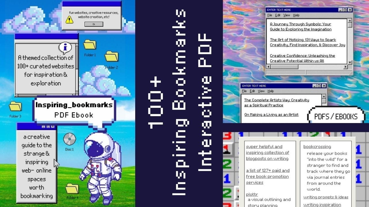 My favorite part of the other collection, however, is the aesthetic. I designed it as an interactive PDF with a retro web theme. All 100+ websites were chosen for creativity, curiosity, and long-term usefulness. It brings together tools, generators, resources, and hidden corners of the web that help you make things, organize ideas, build an online presence, and stay inspired without relying on algorithms. The links are divided by theme—ranging from creative generators and graphic resources to writing tools, website layouts, inspiring essays, and free PDFs—so you can browse with intention or wander freely. Think of it as a personal bookmark folder made public: practical, inspiring, and designed to be returned to whenever you need new input or a fresh direction. Every page contains clickable links that will direct you to their sources.