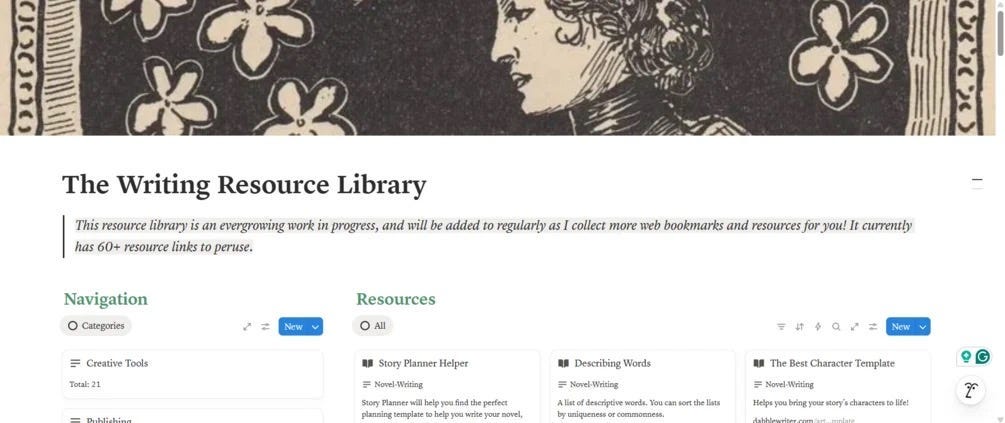 I made a writing resource directory that currently has 70+ links to writing and reading-oriented websites, resources, and tools for your perusal! its all organized into clear categories so you can quickly find what you need while writing, drafting, revising, researching, publishing, or promoting your work. I update it regularly with new resources. And I just dropped the price down to 5$ for lifetime access on Notion. The writing resources are organized into categories such as: • Creative Tools • Novel-Writing • Publishing • Marketing • General Writing • Research • Writing Products • Community !